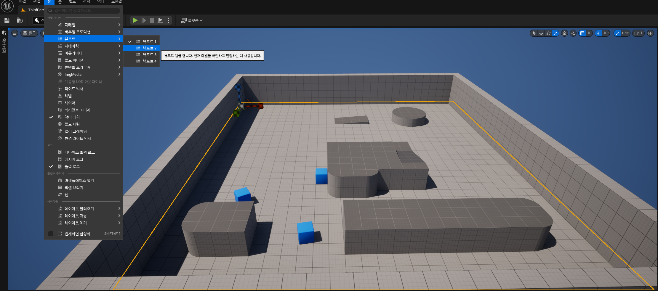 뷰포트는 언리얼 엔진에서 가장 큰 비중을 차지하는 패널로, 게임 세상을 직접 보고 편집하는 공간.